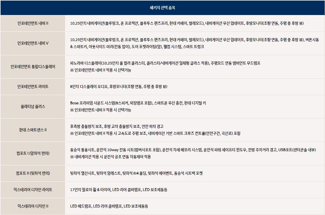 | 1. 10.25인치 풀 컬러 클러스터 2. 10.25인치 네비게이션 3. 듀얼 풀오토 에어컨 4. 스마트폰 무선충전 5. 전동식 파킹 브레이크(오토홀드 포함) 6. 주행모드 연동 앰비언트 무드램프 7. 뒷좌석 에어밴트 |
